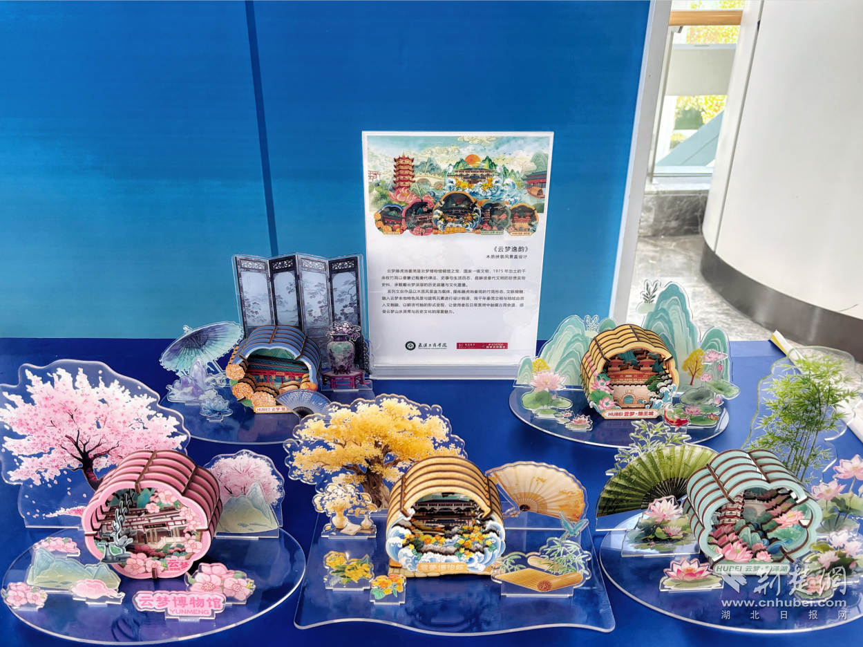 三件作品均根植于湖北地域文化,注重传统与现代的有机结合。“江汉揽胜图书立”以明代名画《江汉揽胜图》为灵感,通过木质立体书立的形式,再现武汉历史景观;“凤舞音乐盒”源于2025年央视春晚“武汉六分钟”节目相关设计,融入楚风意象;“云梦风景盒”则以云梦睡虎地秦简为文化原点,融合梦泽山水与地域建筑元素,将历史底蕴转化为具有现代美感的文创摆件。其中,“云梦风景盒”曾获首届“汉字文化周·楚天杯”全国大学生汉字文化创意设计大赛二等奖。