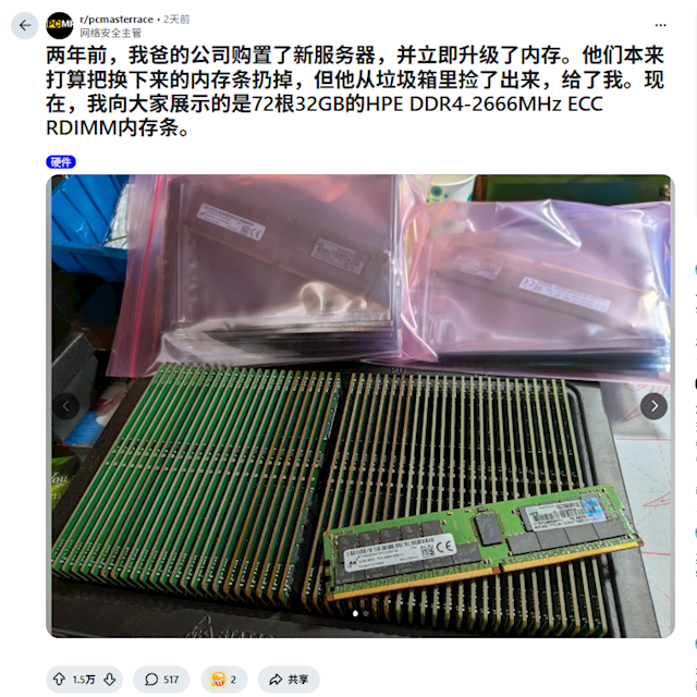 Reddit PC硬件社区r/pcmasterrace的网友cyberchief发帖称:“2 年前(2024年),我爸的公司买了新服务器,到手立刻就升级了内存。换下来的原厂内存条本来要被丢进垃圾桶,我爸把它们从垃圾堆里救了回来,交给了我。给大家看看,72条HPE 32GB DDR4-2666MHz ECC RDIMM内存。”